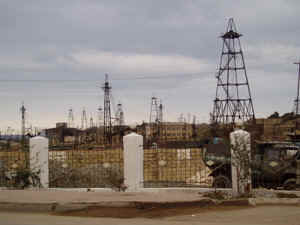cientos de pozos de petróleo situados entre la carretera y el