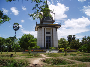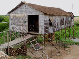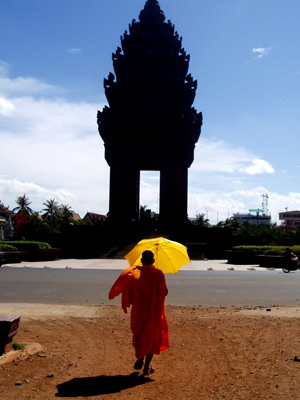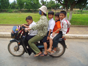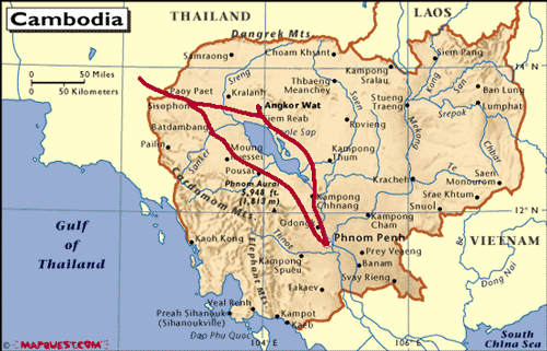 Después de dos horas, por fin ya estamos en Camboya camino de las ruinas de Angkor, a 150 kms de distancia. La carretera no está tan mal, sólo hay 60 kms sin asfaltar y al no haber comenzado aún la época de lluvias, se puede transitar sin problemas más allá de los baches y socavones que abundan. El único problema que se nos presenta es al cruzar un estrecho puente. Como sólo puede pasar un coche por vez, el atasco que se produce es enorme. Después de una hora, gracias a que aparece la policía escoltando a un coche oficial y pone un poco de orden, podemos finalmente cruzar el puente. De no ser así, tal vez aún estaríamos ahí...