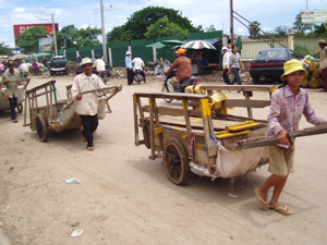 El martes salimos hacia Aranya Pradhet y después de pasar allí la noche, al día siguiente nos dirigimos hacia el puesto fronterizo con Camboya distante a sólo 4 kms de la ciudad. La primera impresión al llegar es de caos generalizado. Una cantidad enorme de carros de madera tirados por hombres y mujeres de todas las edades entran a Tailandia vacíos y regresan a Camboya llenos de frutas, verduras, artículos de higiene, ropa, telas etc., es decir, alimentos o artículos de primera necesidad. Es un ir y venir constante de gente en medio del polvo y bajo un sol abrasador, tal es así que el termómetro de nuestro Toyota llega a los 47 grados !!!
