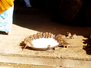 allí en la entrada cada vez había mas ratas y ya no me bastaba con levantar los pies para evitar que me pasaran por encima, hasta casi aplasto una si no hubiese sido porque alguien se dio cuenta y me empujo por detrás. Pero lo mas alucinante de todo esto es que dentro del templo, los peregrinos les dan leche y les preparan comida, mostrando una