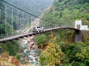 De Gangtok hacemos alrededor de 200 kms para llegar a Peeling, a 1875 metros de altura. La carretera, en parte asfaltada, es una suma de curvas, puentes colgantes,