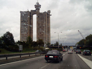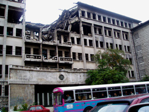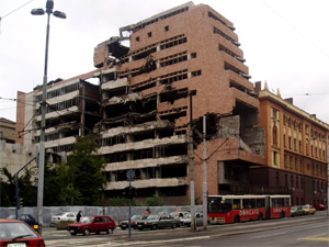 edificios bombardeados por la OTAN. La ciudad es gris, el tiempo