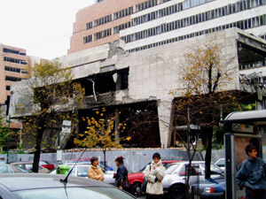 los autobuses junto a los escombros de esos edificios que